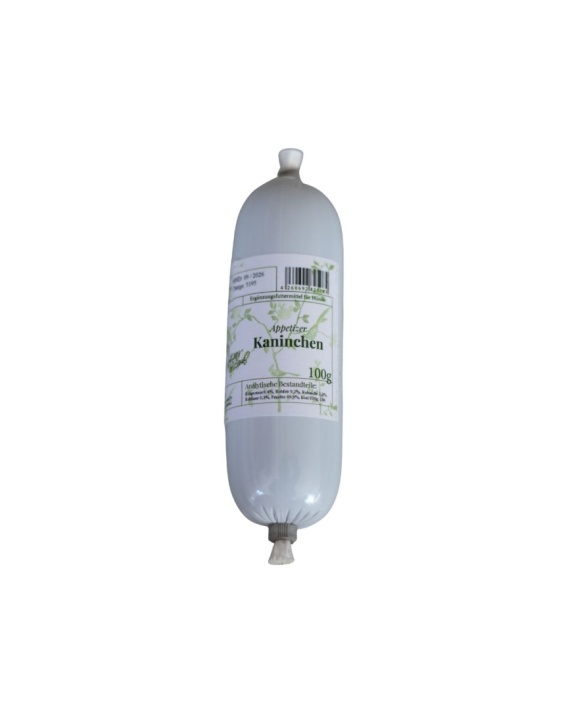 Naturalna kiełbaska z mięsa królika, delikatna i łatwa do krojenia, idealna jako zdrowy przysmak lub nagroda treningowa dla psów wszystkich ras. Bez konserwantów, barwników i sztucznych dodatków. do pokrojenia w kostkę lub większe plasterki.